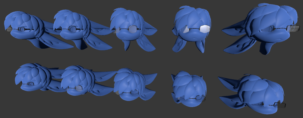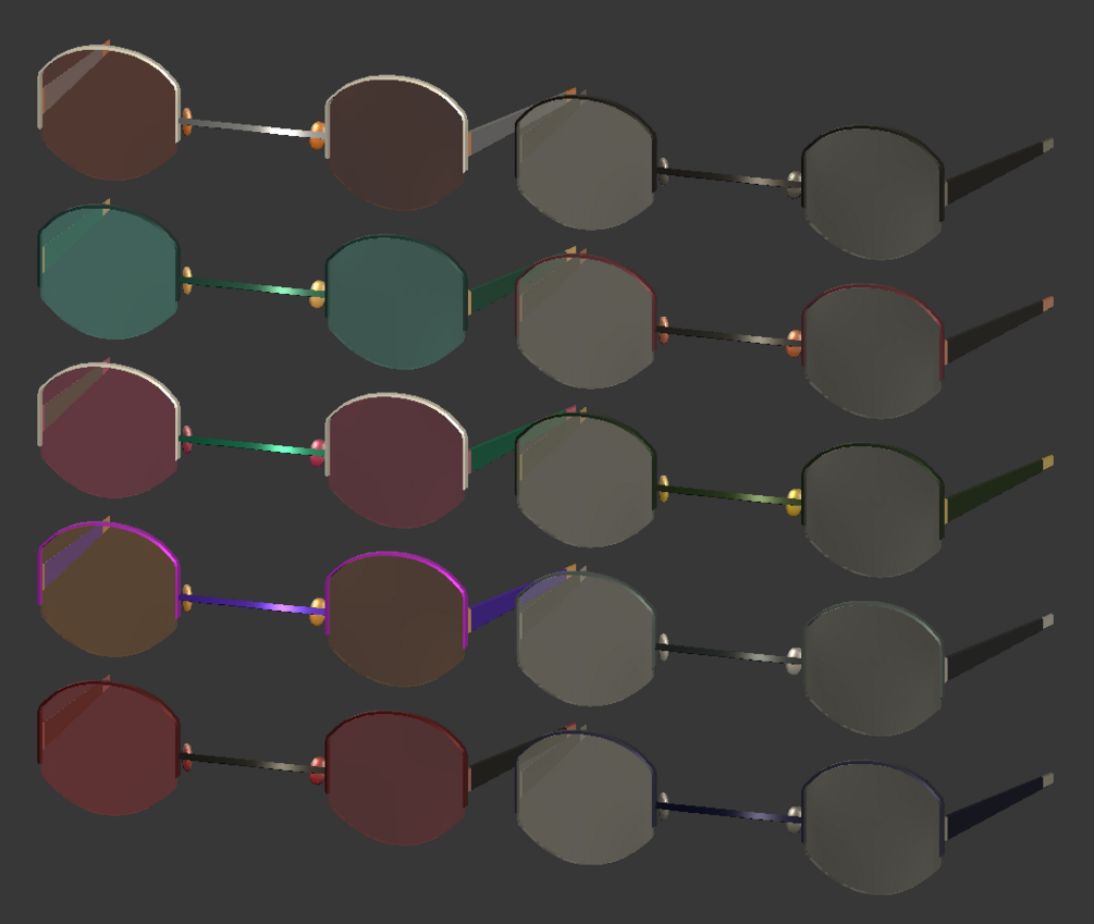 Each eyewear is 2 materials (Frames and Lenses), as well as a plethora of simple skins, materials and supplementary textures for effects.